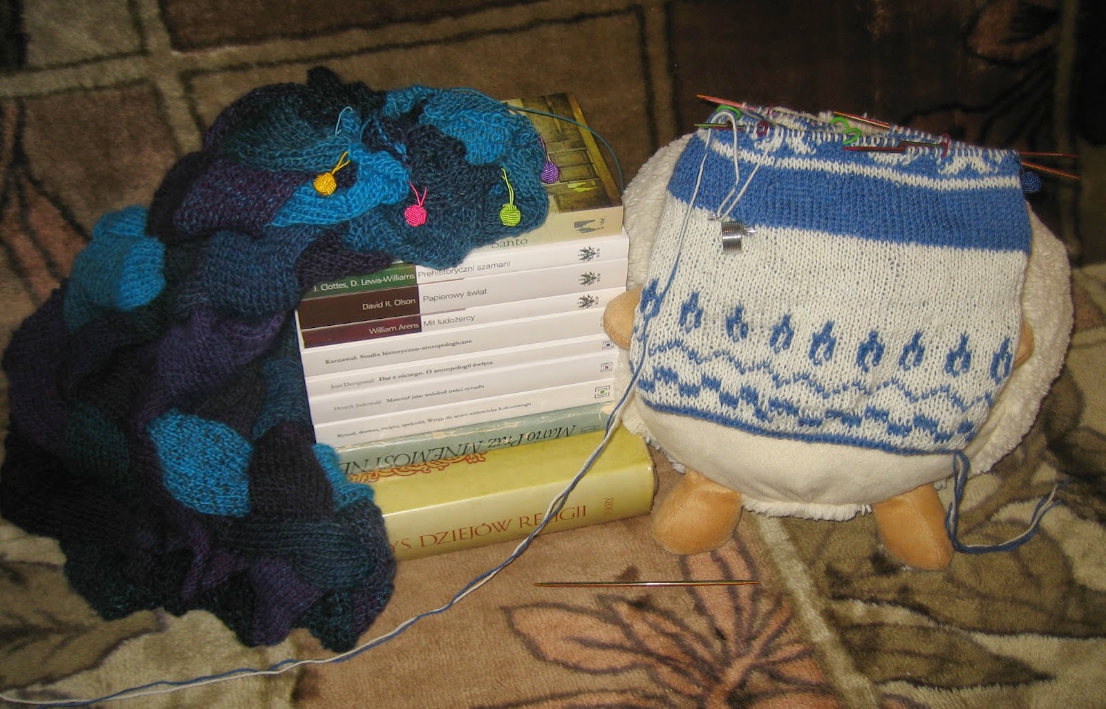 Dziergam z nowym naparstkiem, jest w miarę wygodny, tylko dosyć długo się podpinam do robótki, zanim poprzewlekam nitki przez kółka i zanim przypomnę sobie, na który palec mam je ponawijać. Porobiłabym więc coś innego niż czapkę. Nie to, że czapkę robi się źle, ale robię ją już dosyć długo. I poczytałabym może coś innego niż popularna nauka. Nie dlatego, że o symbolach czyta się źle, ale czytam już o nich dosyć długo.